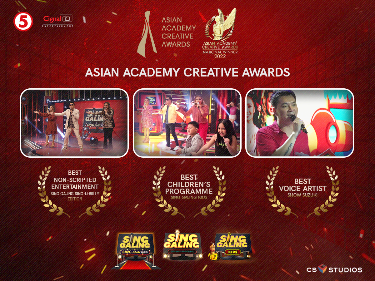 The film and television production arm of Cignal TV, Cignal Entertainment, continues its winning streak as editions of its musical videoke singing reality game show, Sing Galing, bagged several awards as National Winners for various categories at the Asian Academy Creative Awards. Among the accolades Cignal Entertainment received for Sing Galing are Best Non-Scripted Entertainment Program for Sing Galing Sing-Lebrity Edition, Best Children’s Program for Sing Galing Kids, and Best Voice Artist for Sing Galing’s Show Suzuki.