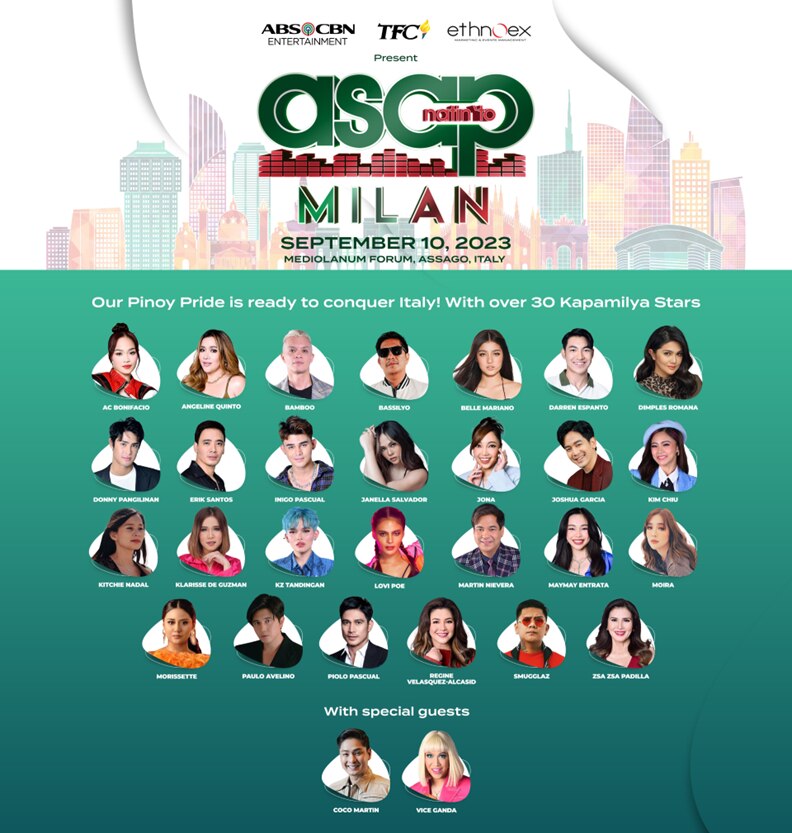 For the show in Milan, the ticket buyers will enjoy not only a stellar line-up but as two ASAP Natin 'To shows will be recorded for its weekend variety series, attendees will enjoy two live shows for the price of one ticket. The following top-notch artists confirmed for ASAP Natin 'To in Milan are (in alphabetical order): AC Bonifacio, Angeline Quinto, Bamboo, Bassilyo, Belle Mariano, Darren Espanto, Dimples Romana, Donny Pangilinan, Erik Santos, Inigo Pascual, Janella Salvador, Jona, Joshua Garcia, Kim Chiu, Kitchie Nadal, Klarisse De Guzman, KZ Tandingan, Lovi Poe, Martin Nievera, Maymay Entrata, Moira Dela Torre, Morissette, Paulo Avelino, Piolo Pascual, Regine Velasquez-Alcasid, Smugglaz, and Zsa Zsa Padilla. And as if this sterling line-up is not enough, ASAP Natin 'To in Milan will also have as special guests two beloved Filipino superstars, primetime king Coco Martin and Asia's phenomenal 'unkabogable' superstar Vice Ganda.