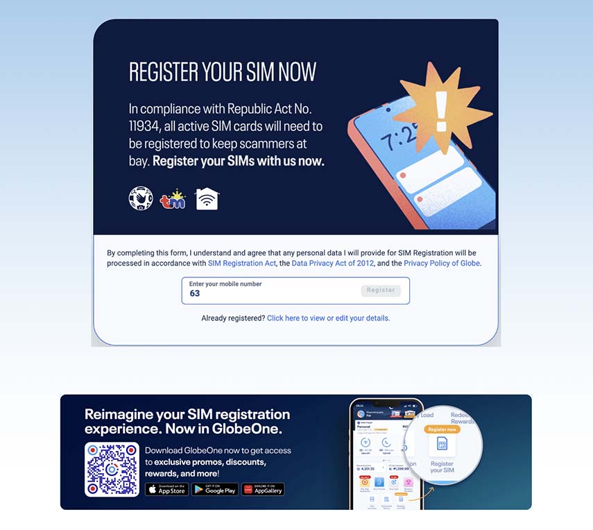 • Globe SIM registration site: https://new.globe.com.ph/simreg