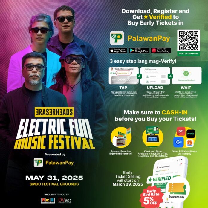 PalawanPay’s integration with the Electric Fun Music Festival marks a significant step towards digitizing the live entertainment landscape in the Philippines. Instead of enduring traditional ticketing queues, fans can now secure their spots through a few taps on their smartphones. This mobile-first approach leverages the widespread adoption of digital wallets, effectively bridging the gap between tech-savvy consumers and the live event industry. The PalawanPay app features a dedicated section for Eraserheads ticket purchases, simplifying the user journey. The platform’s intuitive interface allows users to select their preferred ticket tier, add to cart, and complete transactions within minutes. This seamless process is further enhanced by the app’s real-time transaction confirmation and digital receipt generation, eliminating the need for physical paperwork. And as an early treat for Eraserheads fans, PalawanPay is giving exclusive early access to ticket sales ahead of the general public by providing a 5% discount on all tickets purchased on March 29-April 16, 2025. Take advantage of this sweeter deal in four easy and meaningful steps: