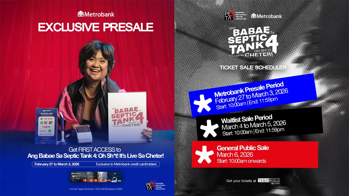 Widely regarded as one of the most iconic performers of her generation, Eugene Domingo reprises her role, bringing her sharp comedic brilliance and fearless energy back to live theater. Her comeback has been eagerly awaited by fans and theater lovers alike, making this production not just a new chapter in the franchise but a landmark event celebrating her enduring impact on Filipino storytelling. As the Official Bank Partner of PETA’s 58th Theater Season, Metrobank marks its third year of partnership by continuing to champion original Filipino works that push creative boundaries, spark national conversations, and support local artists and homegrown storytelling. Metrobank credit cardholders can enjoy exclusive presale access from February 27, 2026 at 10:00 am to March 3, 2026 at 11:59 pm via TicketWorld. A Waitlist Sale follows from March 4 at 10:00 am to March 5 at 11:59 pm, open to patrons who signed up last December 2025, while the General Public Sale begins on March 6 at 10:00 am.