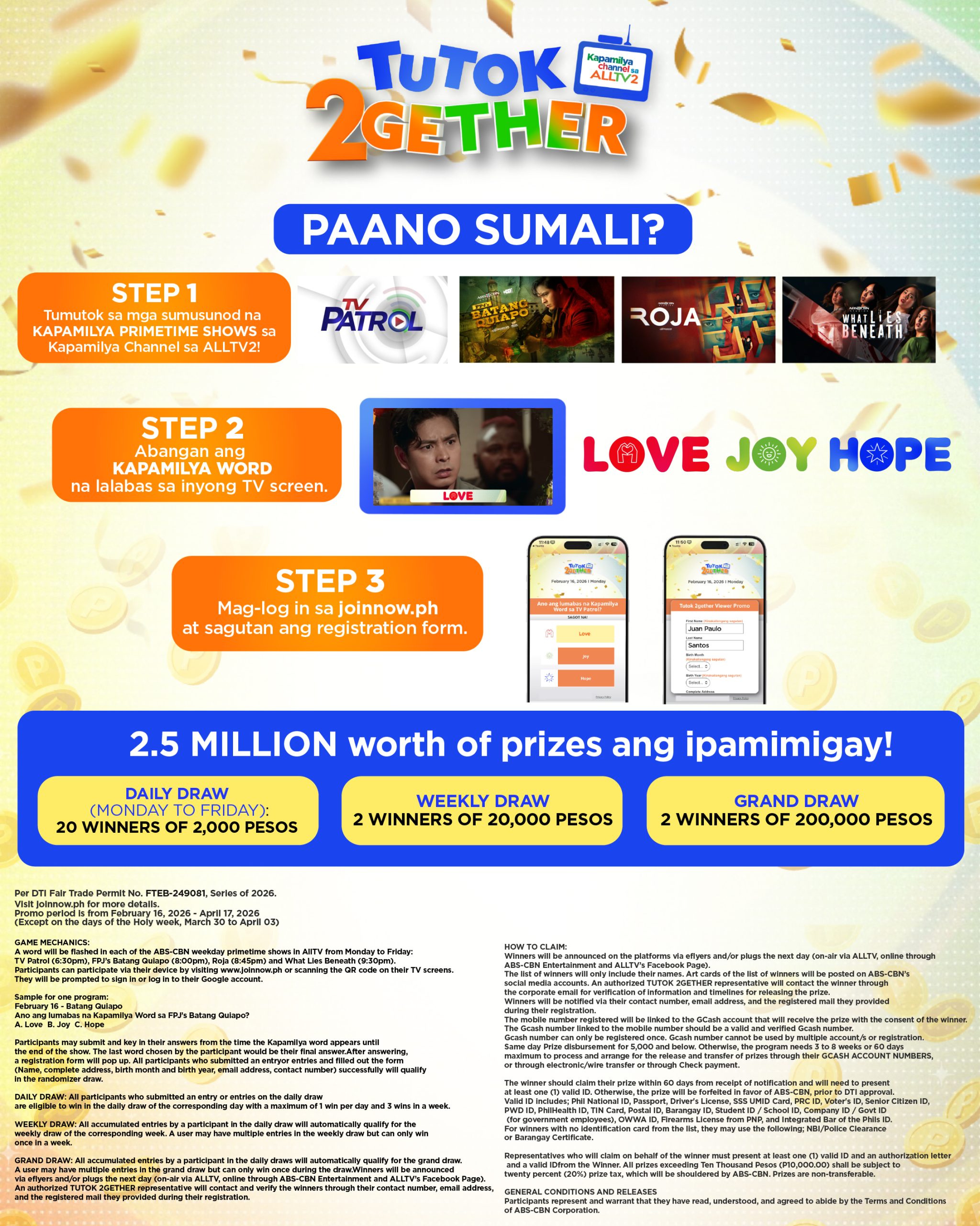 To join the exciting promo, watch any of the currently airing primetime shows from Monday to Friday on Kapamilya Channel sa ALLTV2, and spot the Kapamilya word – Love, Joy, or Hope – that will appear on the TV screen, log-in to joinnow.ph to submit the answer, and complete the registration form to secure the entry. Viewers can enjoy the promo from now until April 17, 2026 where there will be 20 daily winners of Php2,000, two weekly winners of Php20,000, and two lucky winners of Php200,000. Kapamilyas can get their daily dose of news and information from “TV Patrol” at 6:30 pm, follow Tanggol’s action-packed encounters in “FPJ’s Batang Quiapo” at 8:00 pm, enjoy the emotional revelations in “Roja” at 8:45 pm, and follow along the thrilling mysteries in “What Lies Beneath” at 9:30 pm.